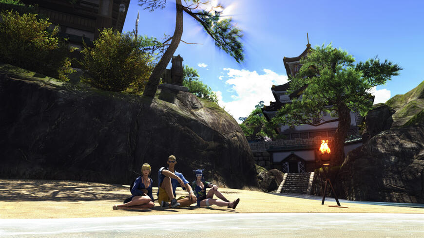 We have a large house in Shirogane (on the beach!) with full crafting facilities and NPC vendors, as well as a chocobo stable where you can leave your chocobo for other members to train it! (There's also a secret gay nightclub, shhh~)